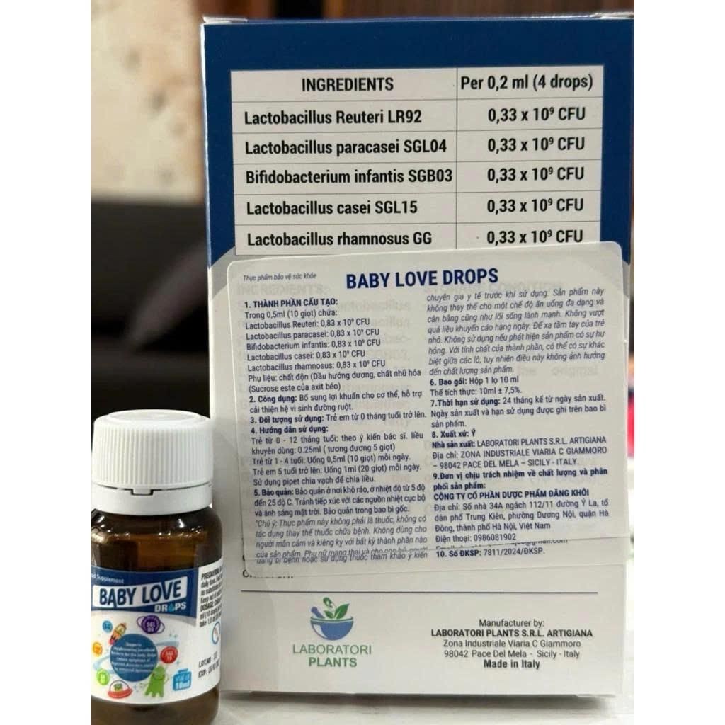 Men vi sinh Baby Love Drops nhập khẩu từ Ý là giải pháp chuyên biệt dành cho hệ tiêu hóa non nớt của trẻ sơ sinh từ 0 tháng tuổi. Sản phẩm bổ sung 5 chủng lợi khuẩn thiết yếu, bao gồm Lactobacillus Reuteri và Bifidobacterium infantis, giúp cải thiện và cân bằng hệ vi sinh đường ruột, hỗ trợ bé tiêu hóa tốt hơn.