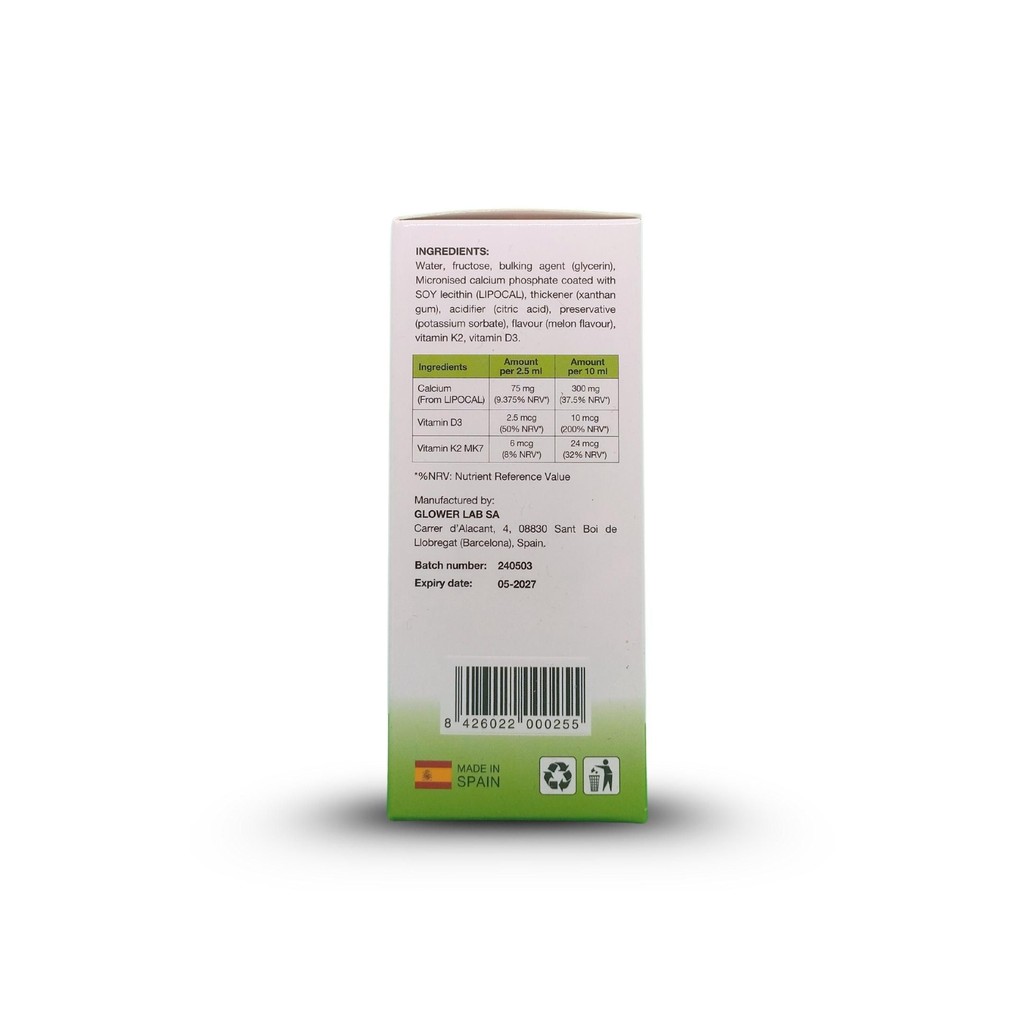 Trong 2,5 ml có chứa:LIPOCAL (tương đương 75mg Canxi) 204,75 mgVitamin D3 (Cholecalciferol- tương đương 100IU) 2,5mcgMenaquinone-7 (tương đương 6 mcg Vitamin K2) 3mgPhụ liệu: Nước, chất tạo ngọt tổng hợp (fructose), chất độn (glycerin), chất làm dày (xanthan gum), chất điều chỉnh độ acid (acid citric), chất bảo quản (kali sorbat), hương liệu tổng hợp (hương dưa lưới).