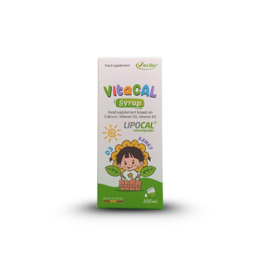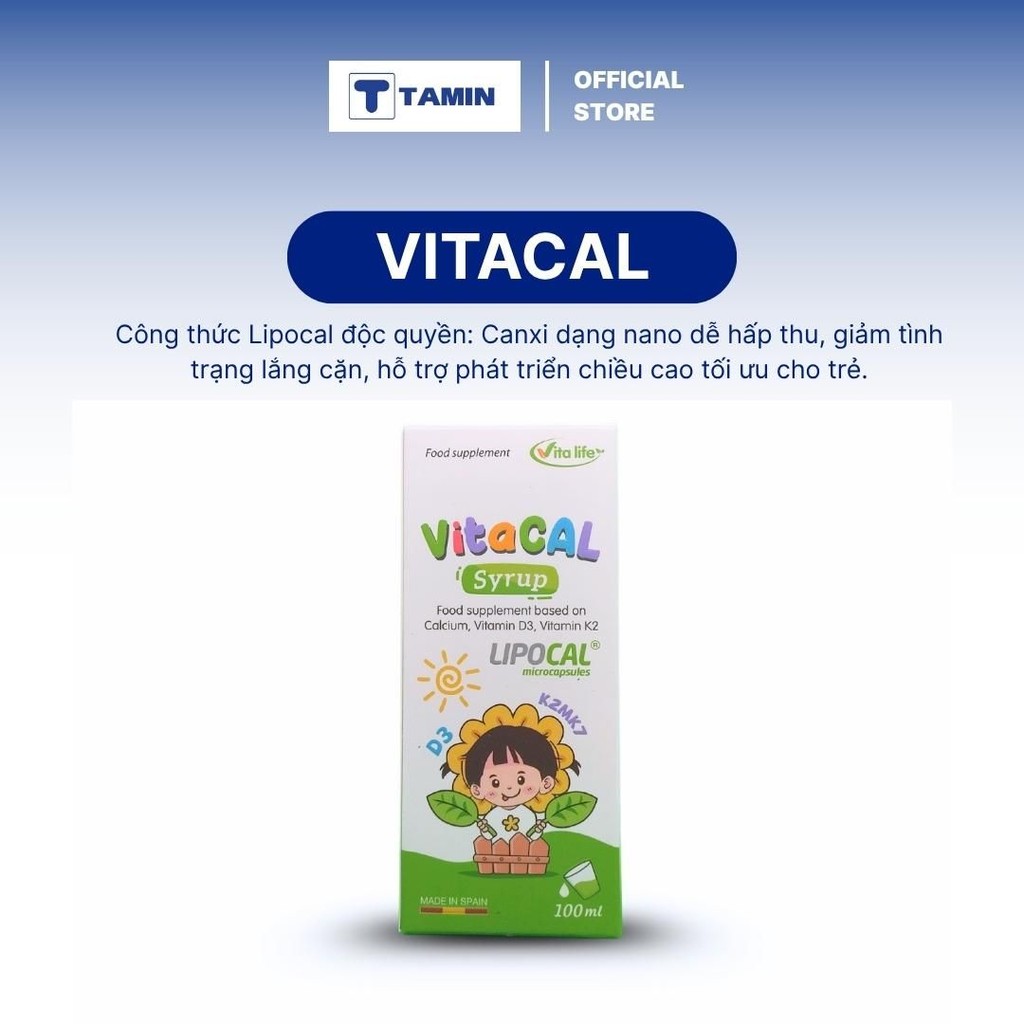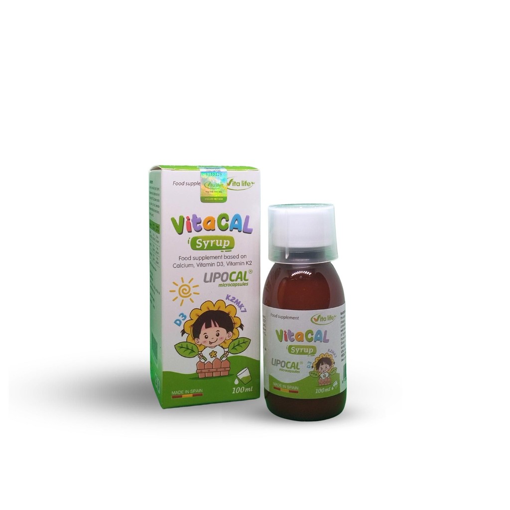 Canxi sinh học trong VITACAL là dạng canxi mới được ứng dụng công nghệ tiên tiến Lipocal – công nghệ làm nhỏ mịn canxi rồi bao bọc trong lớp Lecithin đậu nành có cấu trúc tương đồng và dễ dàng chui qua màng lipid tế bào, giúp trẻ vừa dễ hấp thu, vừa nhận được lượng lớn canxi trong 1 lần uống.Thành phần: