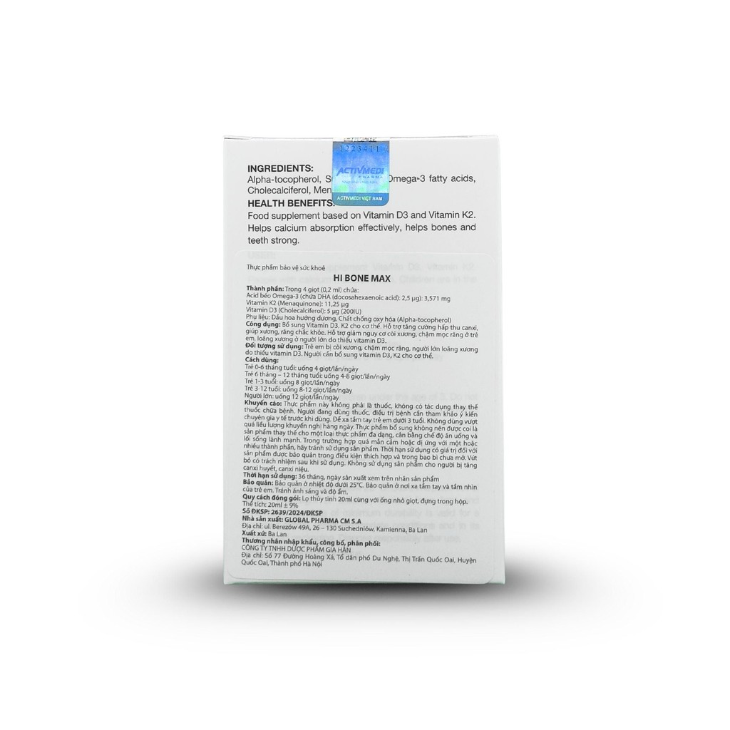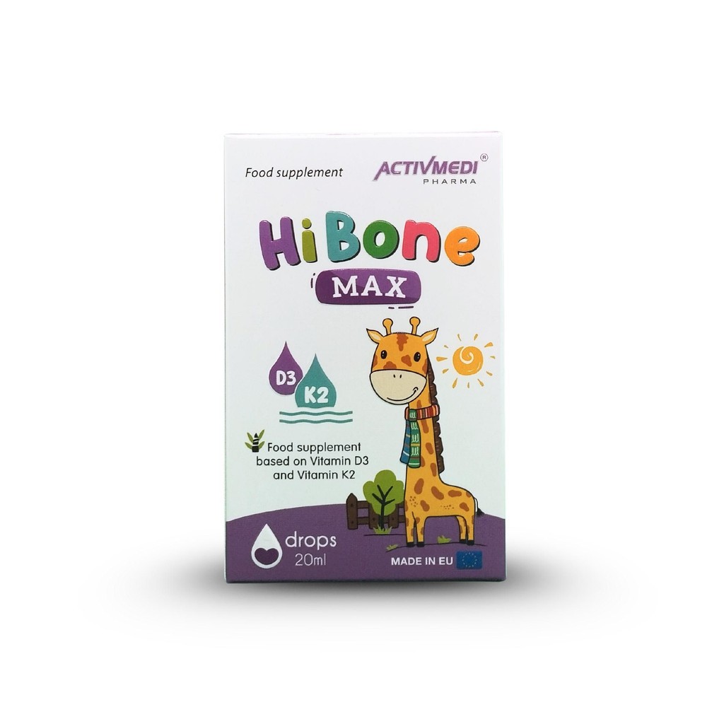 HI BONE MAX là thực phẩm hỗ trợ bổ sung Vitamin D3 và K2 hỗ trợ tăng hấp thu canxi, giúp xương và răng chắc khỏe, giảm nguy cơ còi xương, chậm mọc răng ở trẻ em và loãng xương ở người lớn. Dạng giọt tiện lợi, dễ sử dụng. Nhập khẩu trực tiếp từ Châu Âu