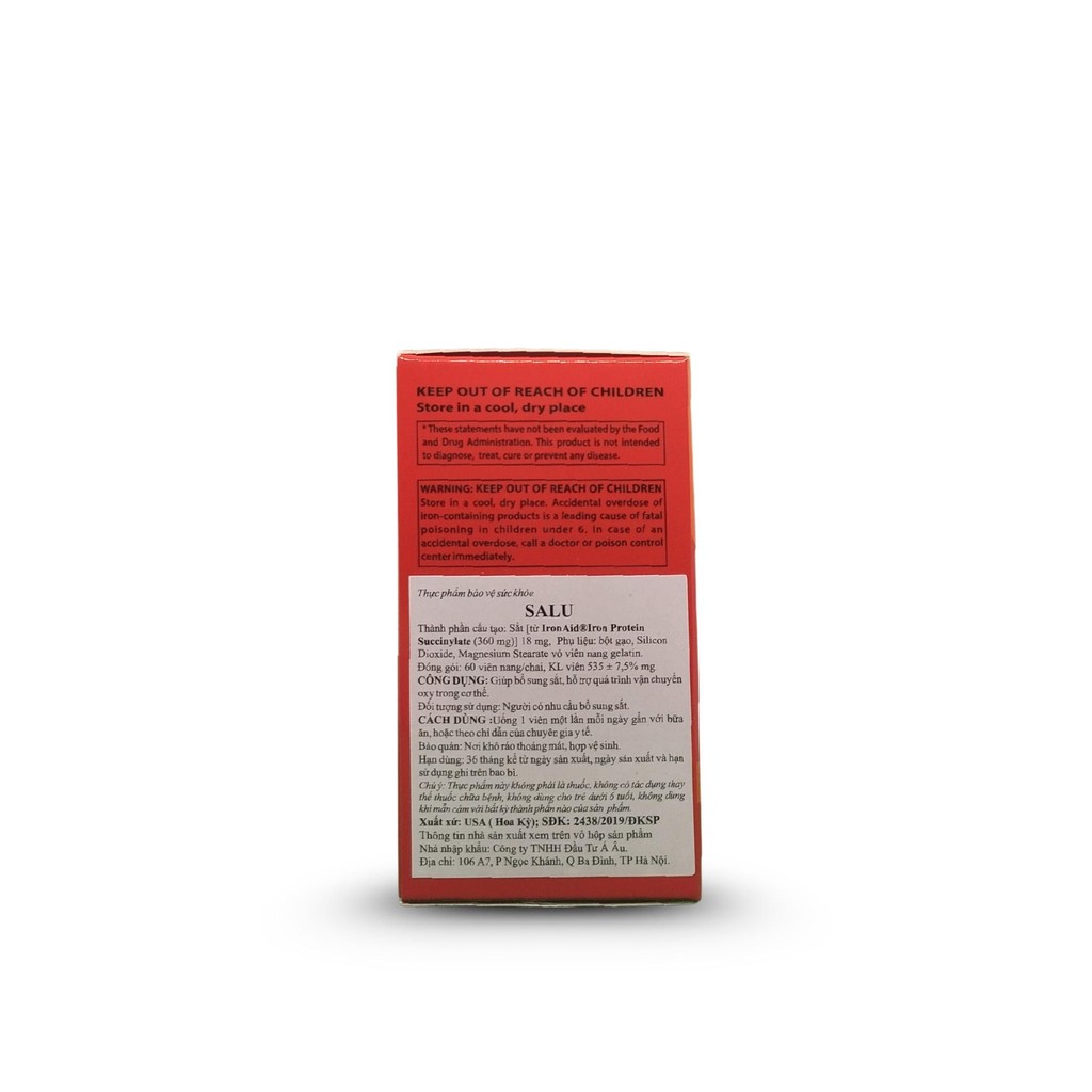 SALU là viên sắt công nghệ Mỹ chứa IronAid Iron Protein Succinylate giúp bổ sung sắt, hỗ trợ vận chuyển oxy, cải thiện tình trạng thiếu máu mà không lo gây táo bón, buồn nôn. Phù hợp với phụ nữ mang thai và người thiếu máu.