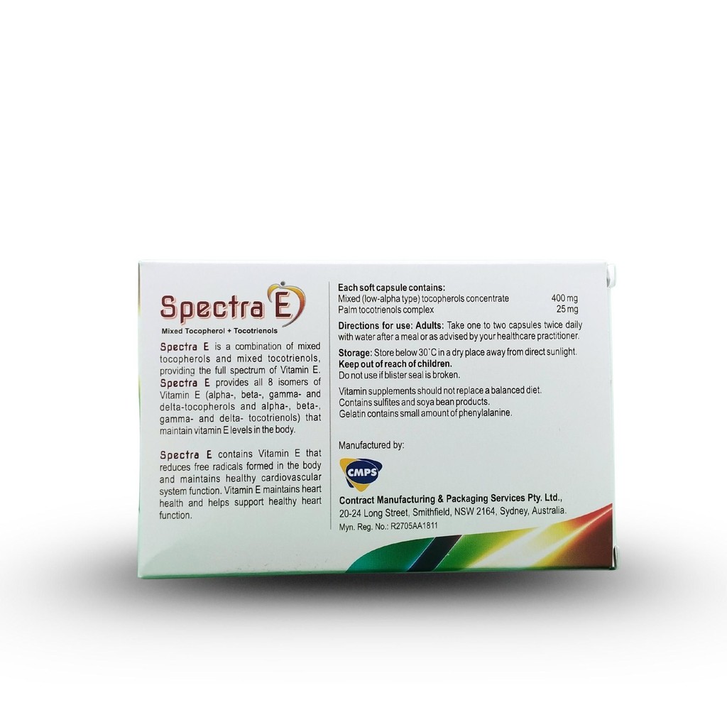 Spectra E cung cấp hỗn hợp vitamin E tự nhiên (Tocopherol & Tocotrienol) giúp chống oxy hóa mạnh mẽ, bảo vệ tế bào khỏi gốc tự do, hỗ trợ tăng cường sức khỏe sinh sản cho cả nam và nữ.
